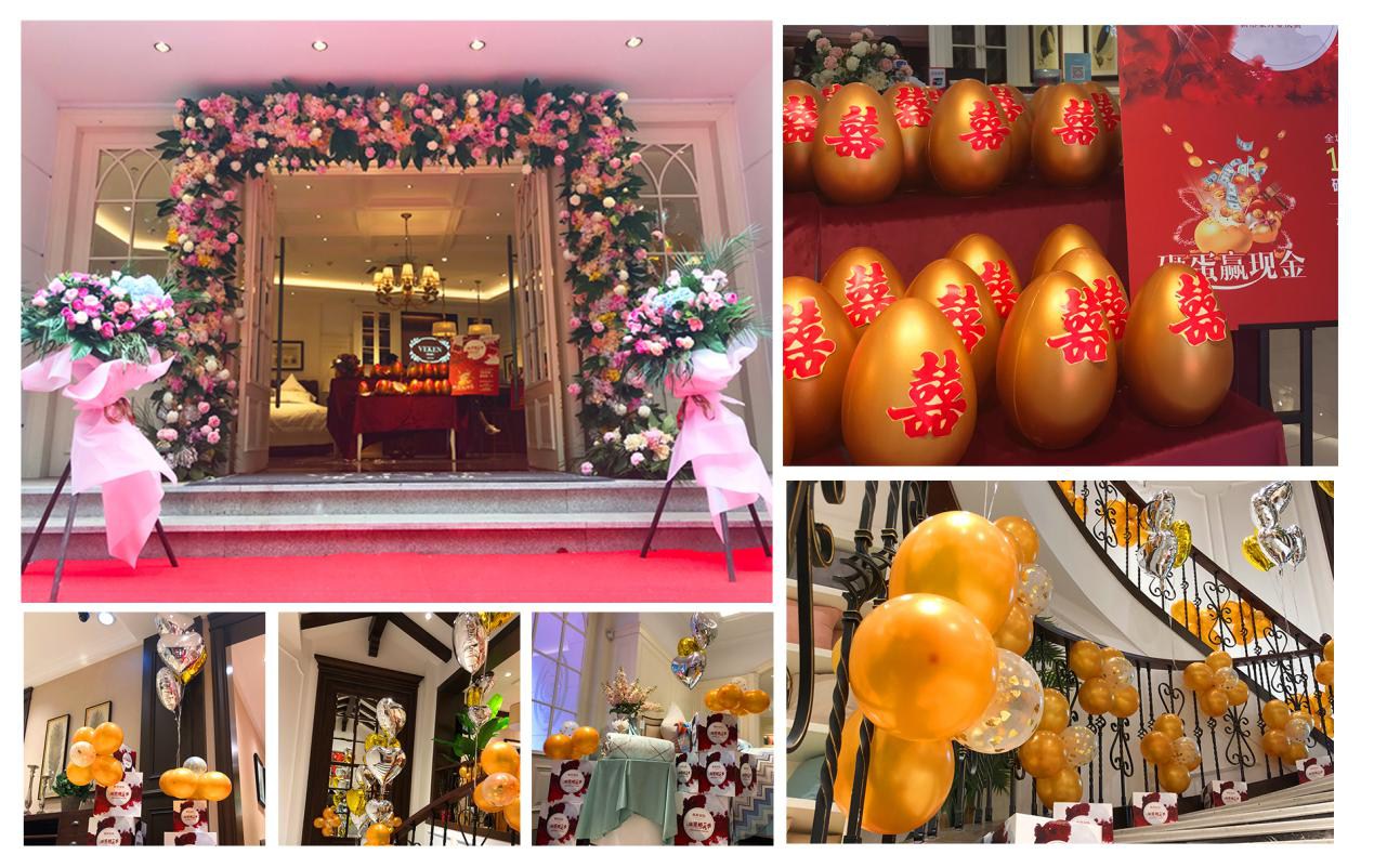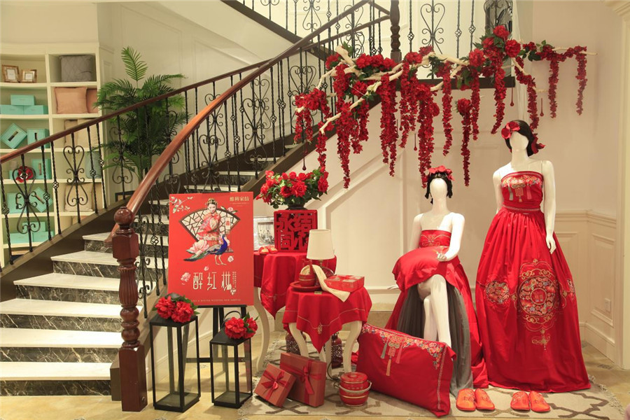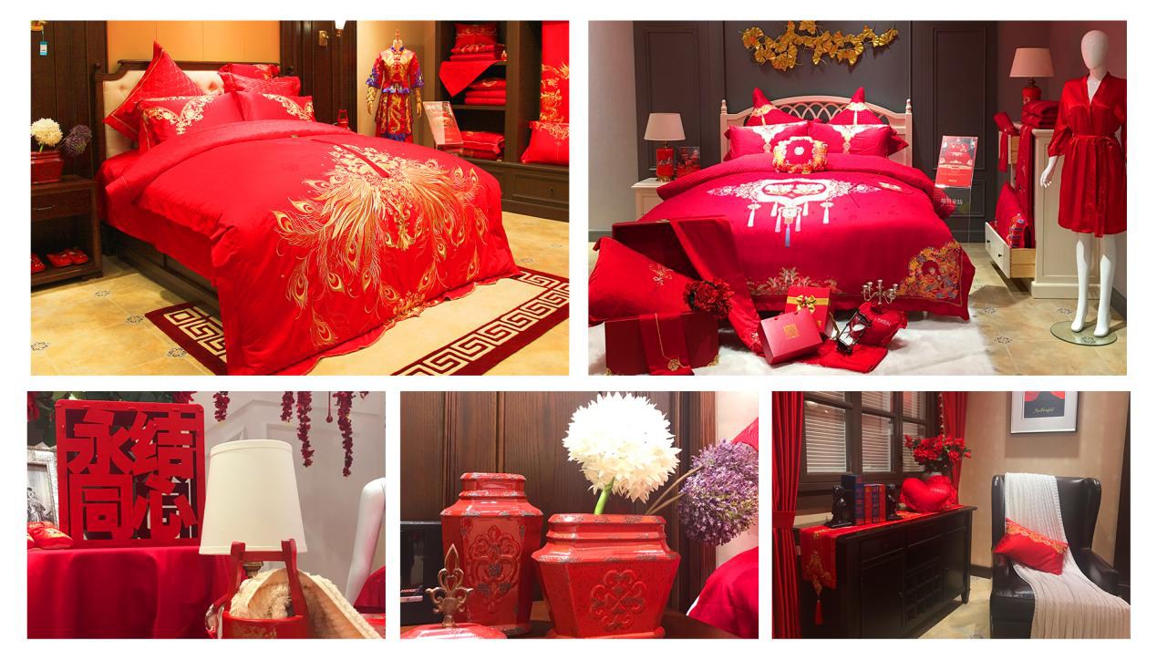 為帶給顧客更直觀舒適的消費(fèi)體驗(yàn),在空間設(shè)計上,維科家紡和義店二樓婚慶家紡場景展示區(qū)摒棄了家紡行業(yè)傳統(tǒng)高柜+展床的方式,將300余平的空間分隔成7個實(shí)景樣板間,真實(shí)體現(xiàn)婚慶床品在日常家居生活中的效果,也能滿足顧客在選購婚慶床品的同時,一站式解決對婆婆禮、長輩禮以及婚慶小件(子孫桶、火銃、虎頭鞋等)的需求。由于該創(chuàng)意目前在家紡行業(yè)中應(yīng)用較少,可借鑒之處寥寥無幾,公司各部門投入了大量的時間精力不斷對方案進(jìn)行修改,力求盡善盡美。整個二樓還設(shè)置了一大一小兩個洽談區(qū),都配備了舒適的沙發(fā)以及精致的茶歇,以供顧客能夠坐下來向?qū)з徳敿?xì)了解床品的信息。在陳列布置上,當(dāng)季新品醉紅妝、子孫滿堂、胭脂醉,熱銷品百子納福、麒麟賀滿堂等都被直接鋪設(shè)于房間內(nèi),并搭配生活化的情景道具,供顧客選購。