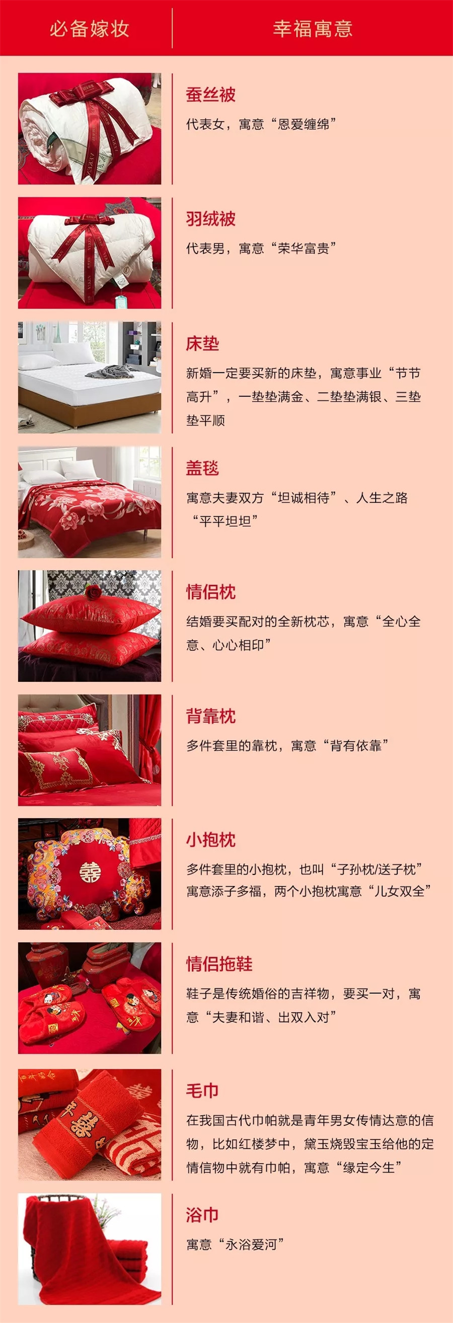 隨著人們生活水平的提高,大家對(duì)婚慶家紡的需求不止僅限于床品,很多巾類中配對(duì)的毛巾、枕巾、拖鞋,甚至家居服的購置也被列入必備清單,新人的嫁妝更顯豐盛。