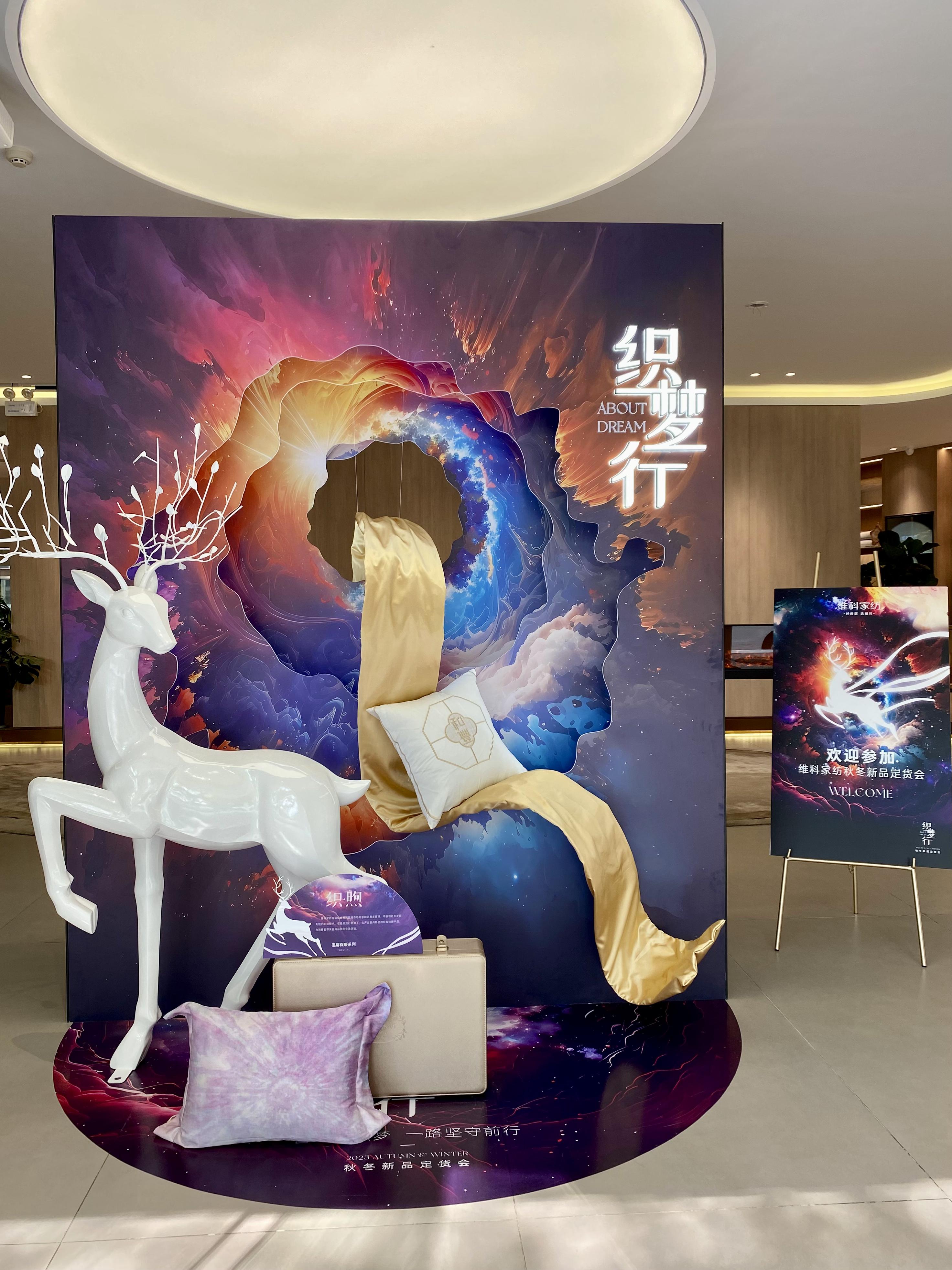 作為定貨場地的維科家紡總店,其陳列布置秉承“織夢行”主題,將夢幻元素與現(xiàn)代風格相融合,打造出一系列充滿想象力和溫暖的場地。