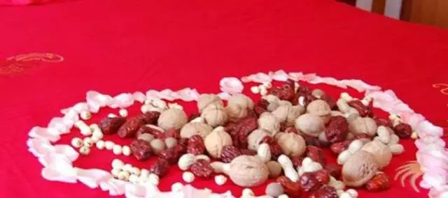 六、鋪床的流程:鋪床過程根據(jù)各地風(fēng)俗不同略有差別,老一輩都知道,一般鄰居中都有這樣的人。主要流程除了掃床、鋪鴛鴦?wù)?、龍鳳被之外,就是“撒帳(撒床)”了,將花生、桂圓、蓮子、栗子、棗等干果鋪撒在婚床上,取義“早立子、蓮生子、花生子(兒女雙全)”的祈愿。